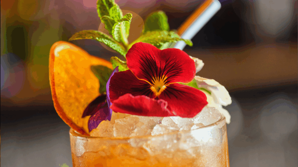 Uma técnica que vem ganhando força é utilizar flores como guarnição. Certifique-se de usar flores próprias para drinks, que sejam comestíveis e livres de agrotóxicos.