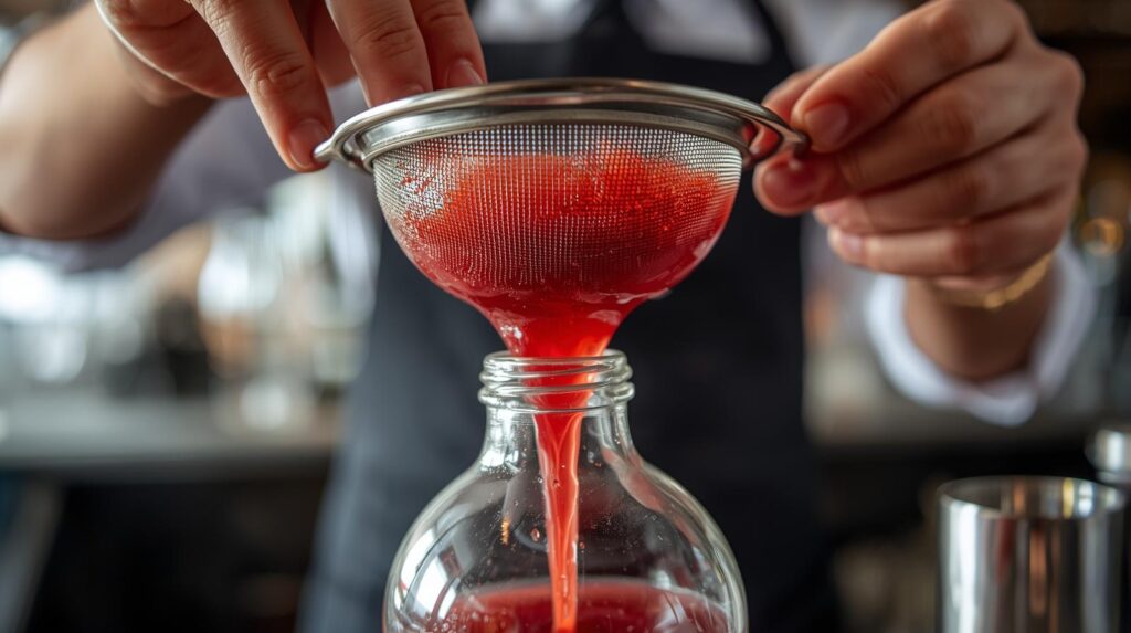 Um dos processos mais importantes na preparação de um xarope saborizado é a filtragem. Um xarope com muita matéria orgânica não terá um bom aspecto para ser acrescentado em determinados coquetéis. Portanto, após a preparação, seja misturando o suco da fruta com o xarope simples ou por infusão, o líquido deve ser filtrado antes de engarrafar, de preferência com uma peneira fina ou coador de pano. A filtragem é o que vai determinar o aspecto do xarope. Quanto mais límpido, mais atrativo ele será.